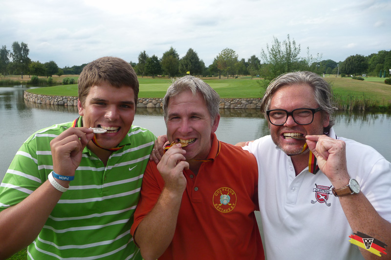 strahlende Gesichter mit Medaillen, Florian Schmitz, Peter Scheel, Jörg Heitmann