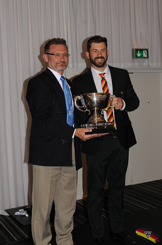 WDGF-Präsident S.Hart überreichtt Allen die WM-Trophäe