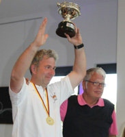 Nach wie vor wehte der Wind sehr stark und kurze Regenschauer bestimmten den Tag. Die Gruppe mit Peter Scheel, Matthias Becherer und Christoph Eggert lieferten unter Begleitung des Fernsehteams ein spannendes Duell auf Augenhöhe. Am Ende hatte Peter Scheel die Nase vorn, er gewann die Meisterschaft mit insgesamt 167 (82 und 85) Schlägen vor Matthias Becherer mit 174 (88 und 86) Schlägen und Christoph Eggert mit 178 (86 und 92) Schlägen, der doch noch auf dem 4. Platz abrutsche. Guter Dritter wurde Jörg Heitmann auf seinem Heimatplatz mit 176 (88 und 88) Schlägen.