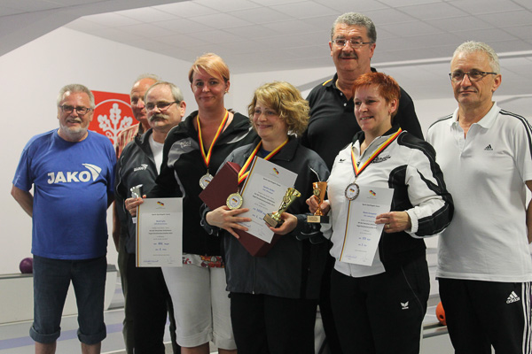 v.l.: Dolmi W. Keller, TSG Bürgel Kegelabt.leiter H. Schmidt, H. Michel, Lyhs (Bremerhaven), Sandra Keller (Offenbach), D.Graupeter (Ludwigsburg), Techn. Leiter J. Rothmeier, hinten Verbandsfachwart B. Müller