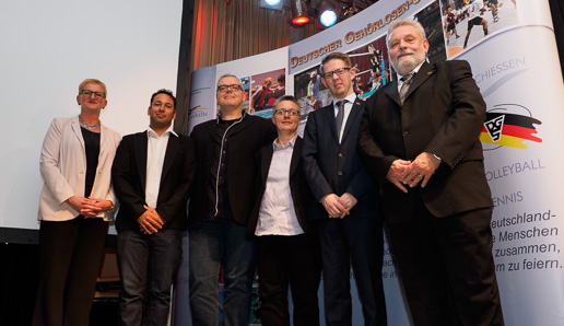 Der neue Vorstand des gesamten Präsidiums (v.l.): Generalsekretärin Diana Aleksic, 1. Vorsitzender DGSJ Daniel Haffke, Vizepräsident Finanzen Günter Fressmann, Vizepräsident Breitensport/Sportentwicklung Petra Brandt, Vizepräsident Leistungssport Andreas Mühlbauer-Füll und DGS-Präsident Winfried Wiencek